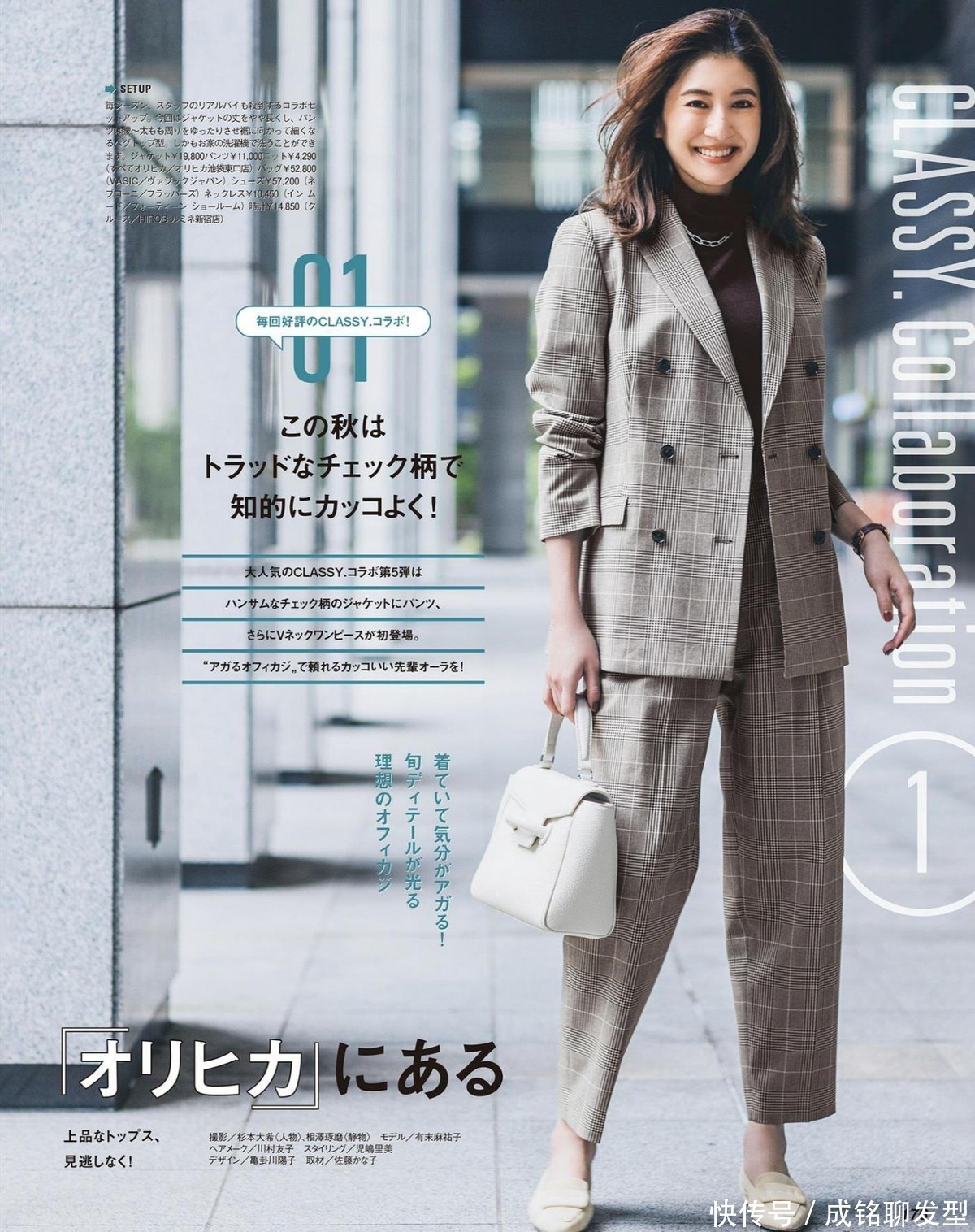 相对来说西装呈现出来的正式气质确实充沛,可以采取它和高领衫的结合,就能塑造出符合秋日温度的日常穿搭,干练又利落。